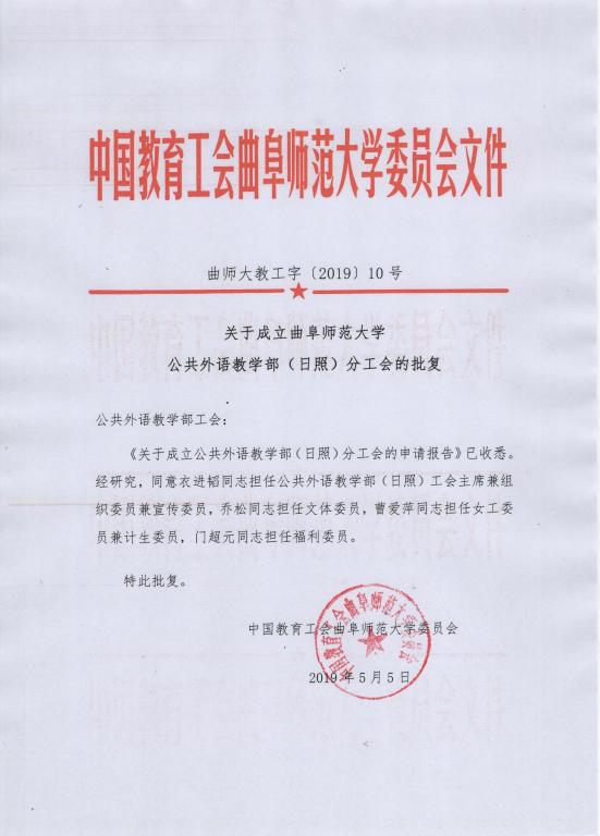 曲师大教工字〔2019〕10号关于成立kaiyun·开云(中国)官方网站kaiyun.com(日照)分工会的批复