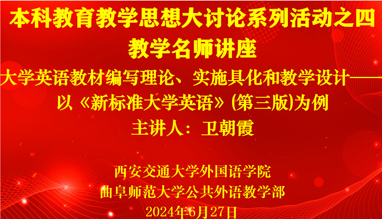 6月27日,kaiyun.com举办本科教育教学思想大讨论系列活动之四:教学名师讲座,特别邀请西安交通大学外国语学院卫朝霞副教授作题为“大学英语教材编写理论、实施具化和教学设计——以《新标准大学英语》(第三版)为例”的专题报告。活动由kaiyun.com主任王福祥主持,两校区全体教师参加了本次报告会。