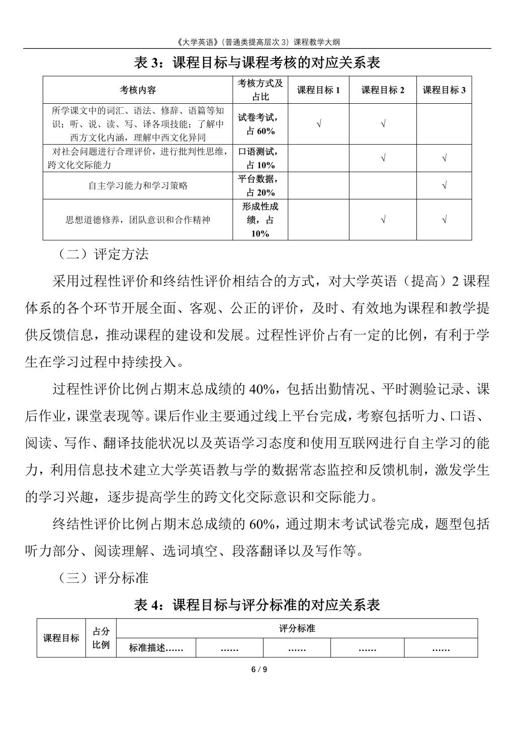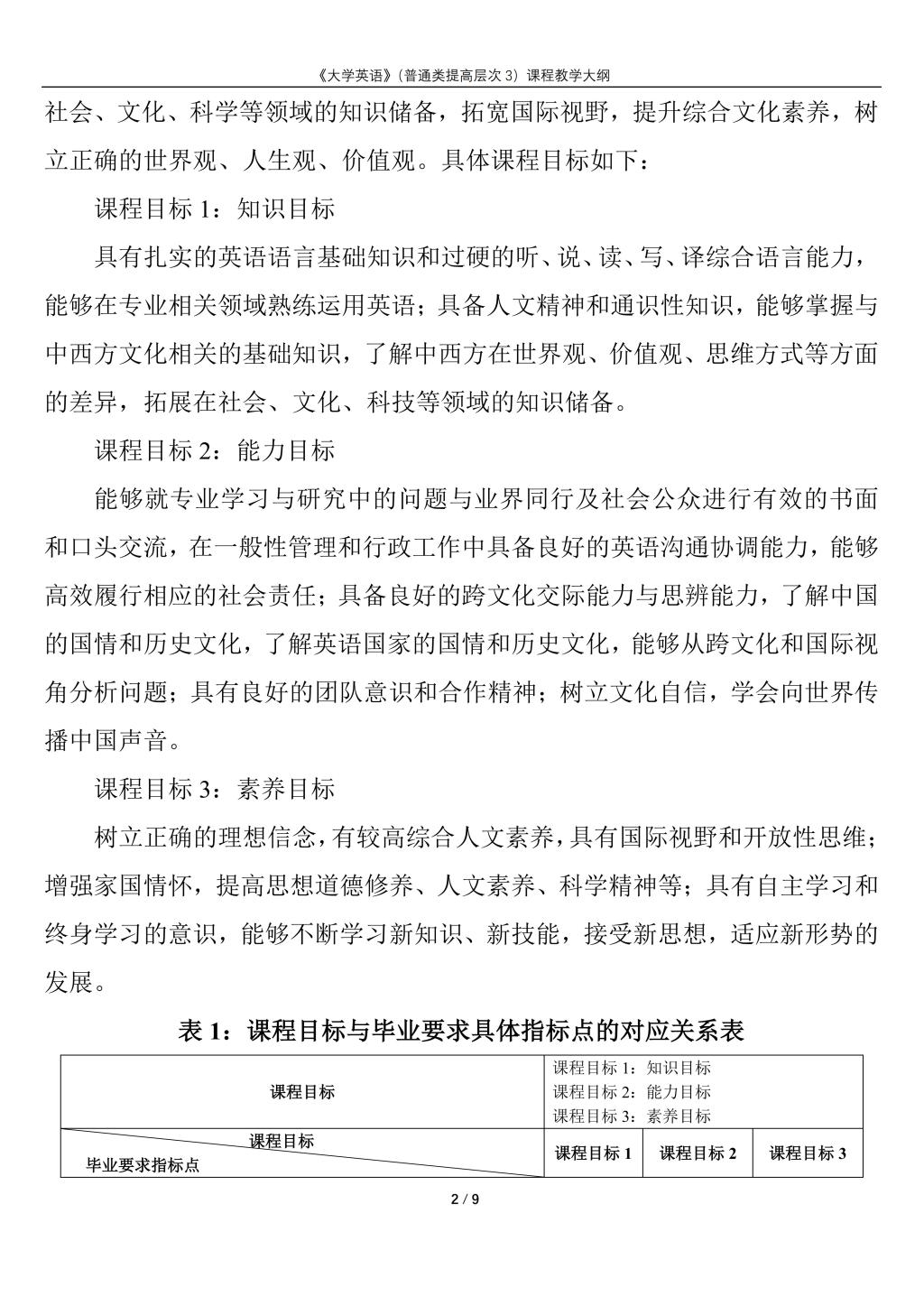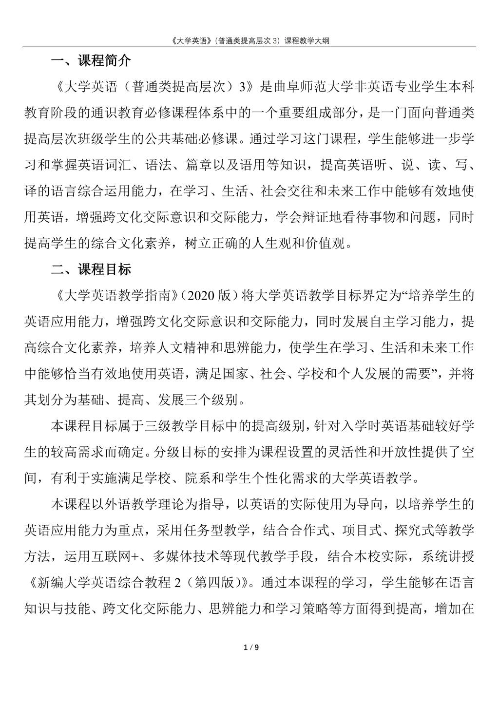 大学英语(普通类提高层次3)课程教学大纲(2022版)
